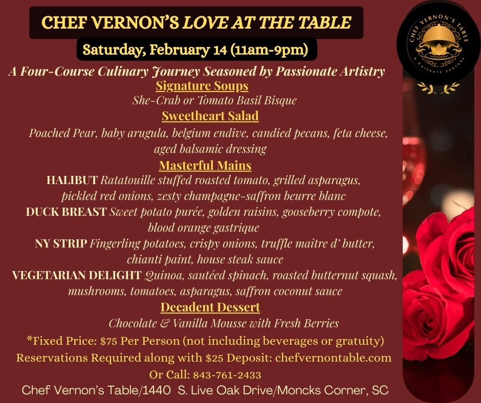 To make a reservation at Chef Vernon's Table, you can call the restaurant directly or visit in person to check availability. If you're planning a special occasion or dining with a group, it's always a good idea to book in advance to secure your spot!
